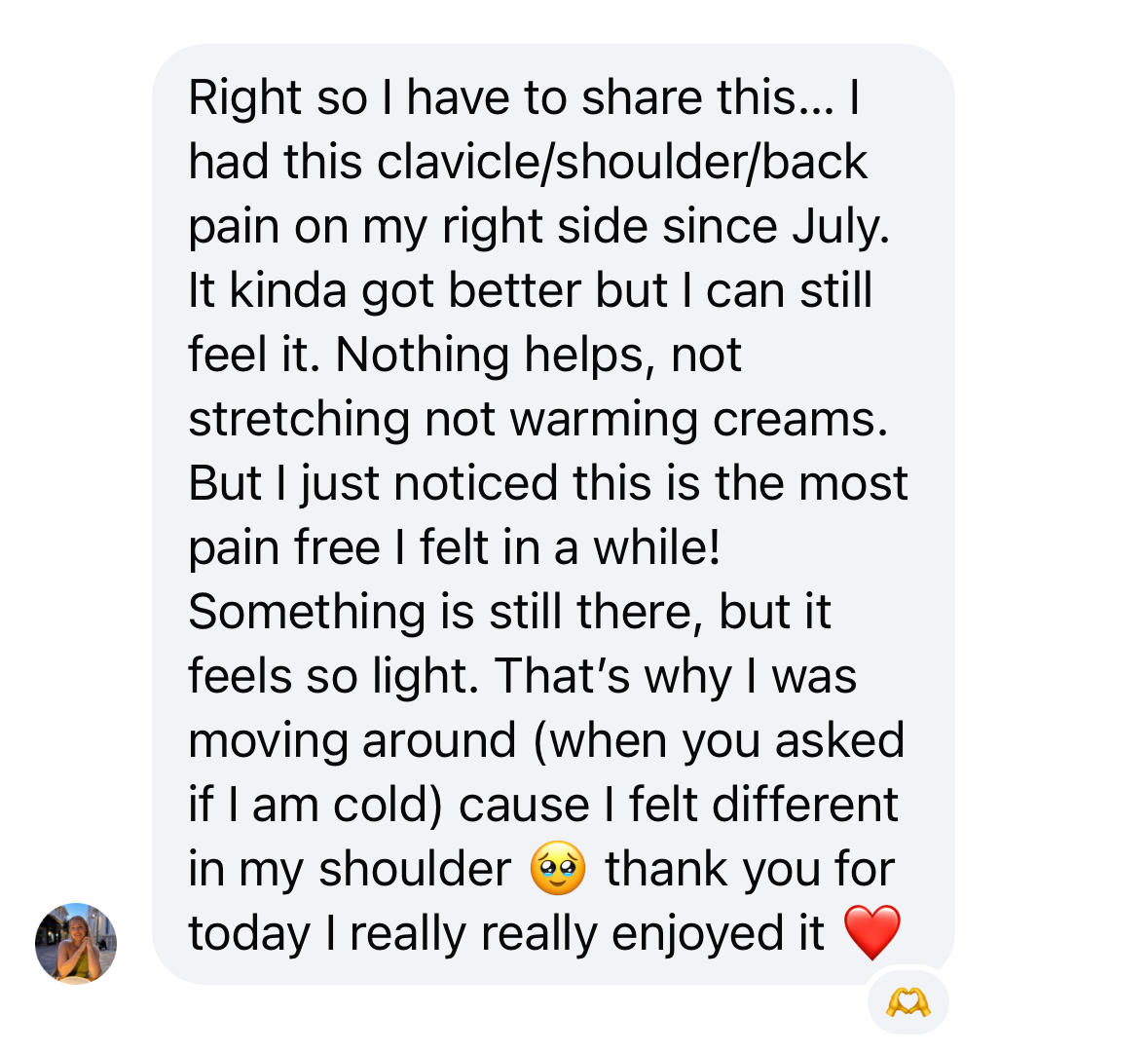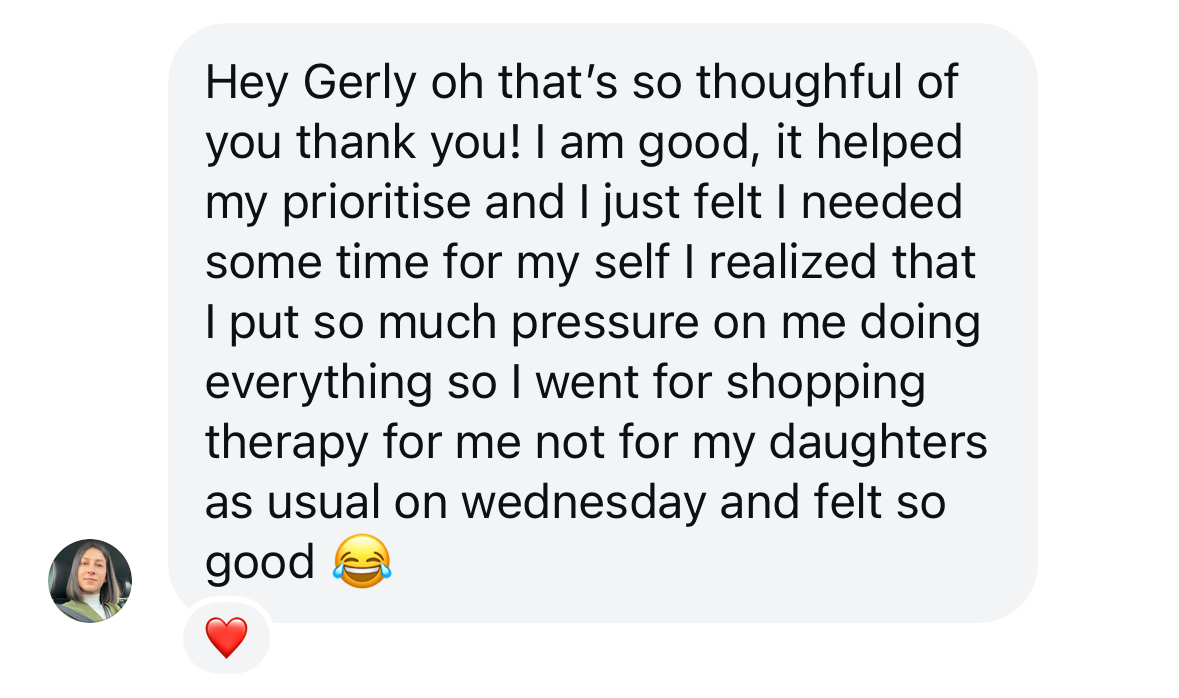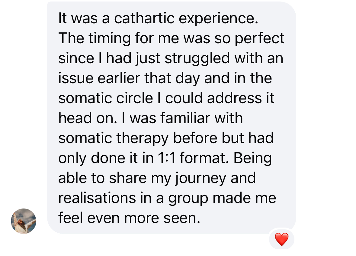 The group dynamic was so helpful! I'm more shy to talk and share normally, but being seen and held without judgement and with love made me realize we all have vulnerabilities, we are not alone. Working with Gerly has helped me to sit with my emotions, and to witness & accept them. I feel so much lighter and don't feel held back anymore!